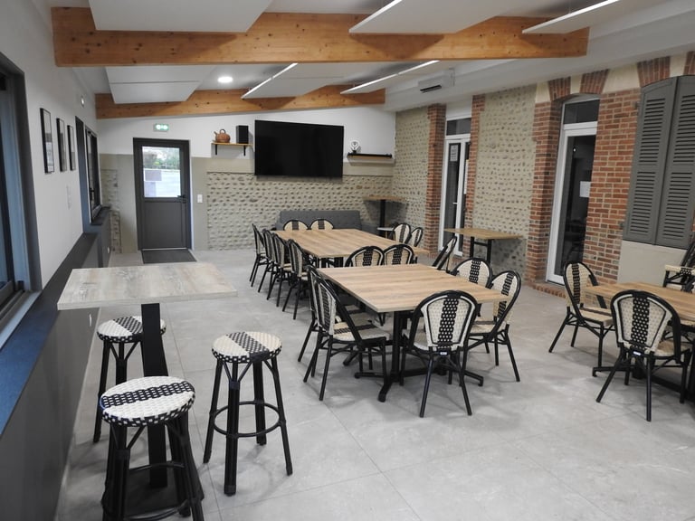 On y trouve un écran géant, un canapé et de nombreuses tables et chaises que l'on peut moduler selon nos envies et besoins.